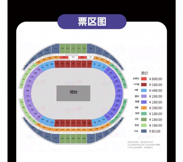 根据票务平台信息,超级杯门票价格在80元-880元之间,分为80元(D类)、180元(C类)、280元(B类)、480元(A类)、580元(VIP票)以及880元(主席台)6档。